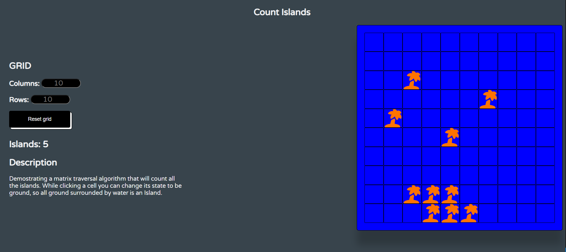 Algorithm demostration of connected islands counting with JavaScript
